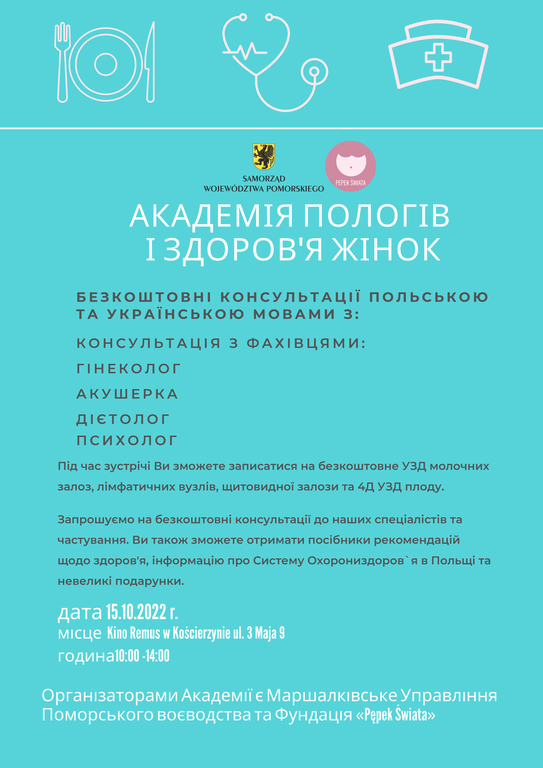 Wykład oraz spotkanie z położną, dietetykiem, psychologiem oraz ginekologiem mówiącym po ukraińsku. Specjaliści będą w towarzystwie tłumaczy. W trakcie wykładu zostanie zaprezentowany materiał wideo „Przyśpieszony kurs szkoły rodzenia” z przerwą na pytania od uczestniczek spotkania.
