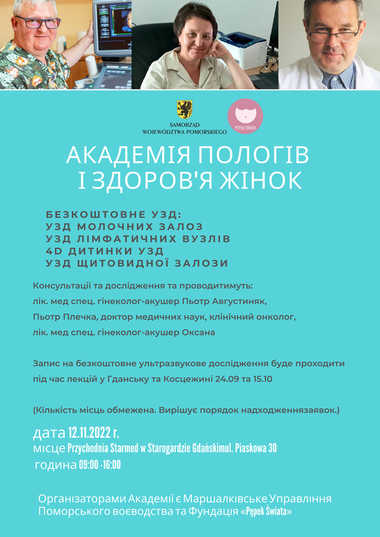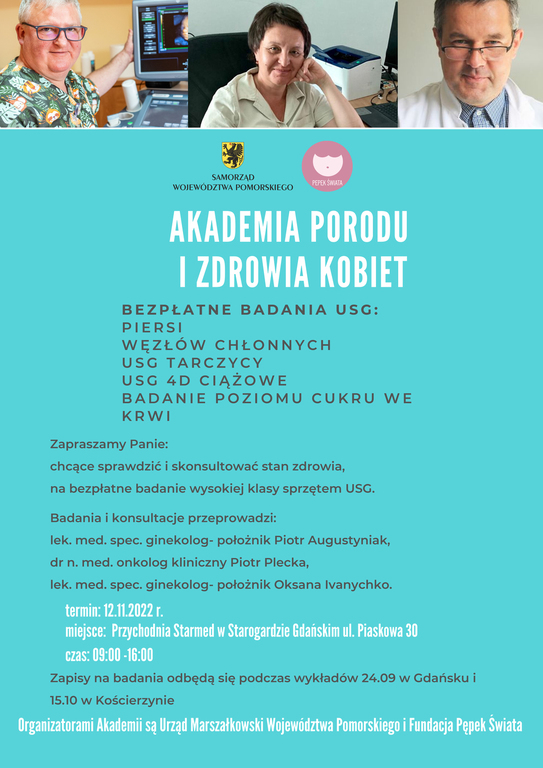 Fundacja Pępek Świata z Urzędem Marszałkowskim Województwa Pomorskiego, organizują w ramach "Akademi Porodu i Zdrowia Kobiety" spotkanie w formie bezpłatnych konsultacji dla kobiet w ciąży i nie tylko oraz Białą Sobotę. Podczas Białej Soboty będzie możliwość wykonania bezpłatnego badania USG piersi, wezłów chłonnych, tarczycy i USG 4D ciążowe.
