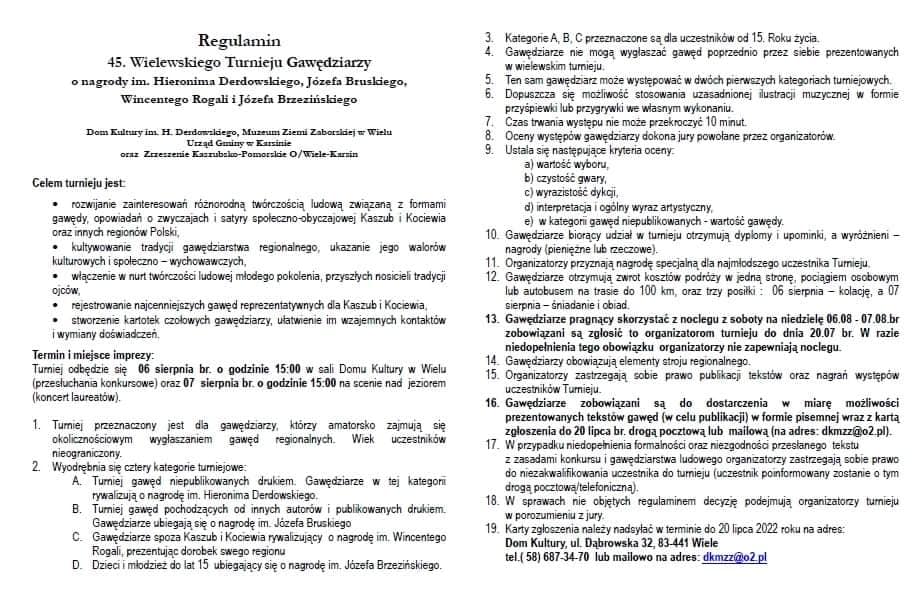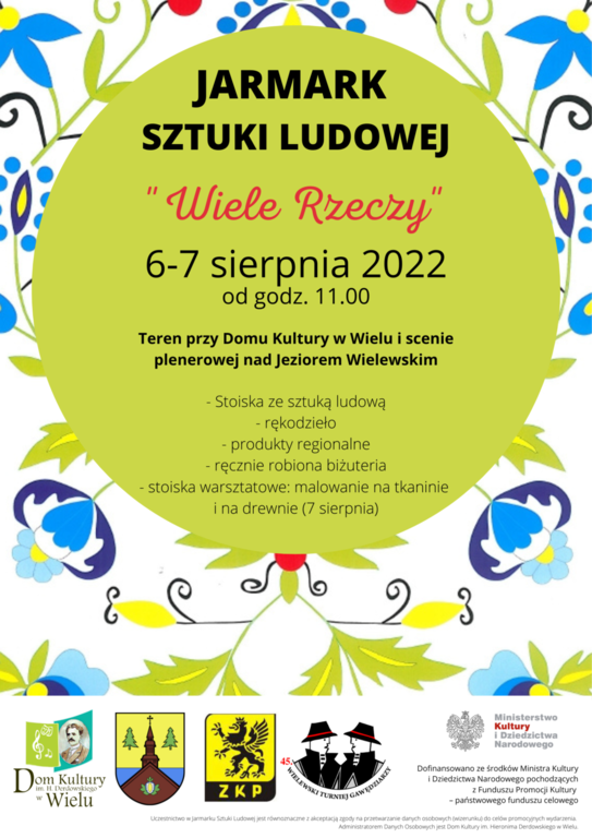 Informujemy, że 45. Wielewski Turniej Gawędziarzy w tym roku odbędzie się w dniach 06/07 sierpnia. Serdecznie zapraszamy twórców ludowych do udziału w Jarmarku sztuki ludowej "Wiele Rzeczy" oraz gawędziarzy do przesyłania zgłoszeń udziału w Turnieju w poszczególnych kategoriach